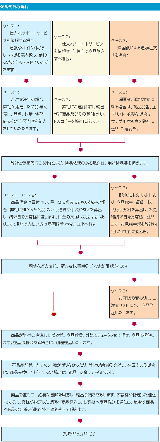 御社に代わって海外との輸出 輸入業務を貿易代行いたします。実際、中国現地の卸し市場買い付けに来られる客様の中には、輸入貿易(貿易代行)が大変だと、難しいと思っている方が多いですが、弊社を通せば、格安な手数料で、面倒な手続きすべてを代行いたします。チャイナトレーディングはちゃんと責任を持って、ご注文の商品をお預かり~検品~梱包~輸出手続~発送、あるいは、新規の取引先の輸出入の業務代行(貿易代行)業のみとなりその代価を手数料として頂きますなどすべての業務を承ります。代行手数料は商品代金総額の7%とさせて頂き、手続きが同じなので、手数料は500元以下の場合は、500元を基本手数料とさせて頂きます。現地人民元よる支払いは、当日のレートで計算させて頂きます。どの時点からでも各種貿易(貿易代行)事務/実務をワンストップで代行いたします。個人輸入代行から、貿易部門業務(貿易代行)全般のアウトソーシングまで幅広く対応、必要時に御社の貿易(貿易代行)部門としてご利用ください。