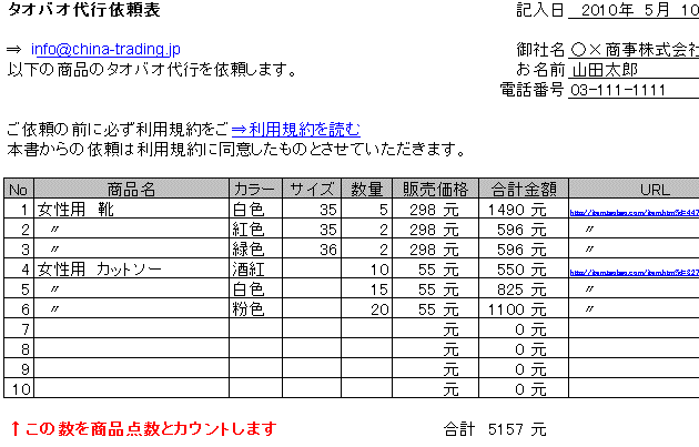 をご使用いただき、メールにてご連絡くださいませ。⇒ info@chinatrading.jp ※件名は【タオバオ代行】でお願い致します。